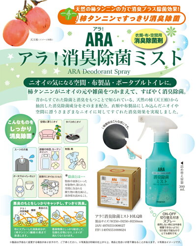 商品の仕様 ●成分/柿タンニンエキス ●付属/300ml詰め替え容器 ●メーカー/フェニックス --------------------------------------------------------- 除菌・消臭剤・除菌・消臭・スプレー・年末大掃除・掃除グッズ除菌スプレー 除菌・消臭 アラ 消臭除菌ミスト 10L ニオイの気になる空間・布製品に。